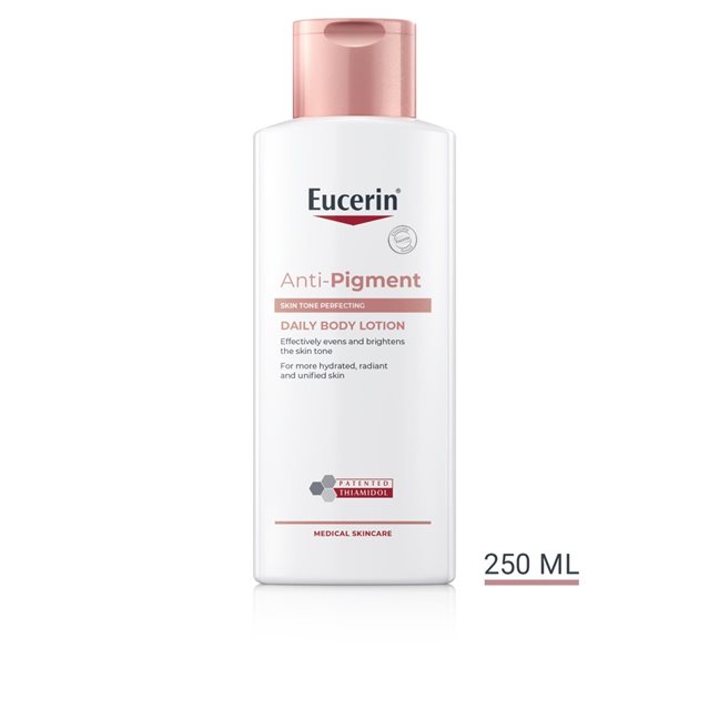 Eucerin Anti-Pigment Daily Body Lotion combines powerful active ingredients that work in different ways to promote your skin’s radiance and reduce hyperpigmentation at the source by effectively reducing the appearance of dark spots large areas of pigmentation and post-inflammatory hyperpigmentation: