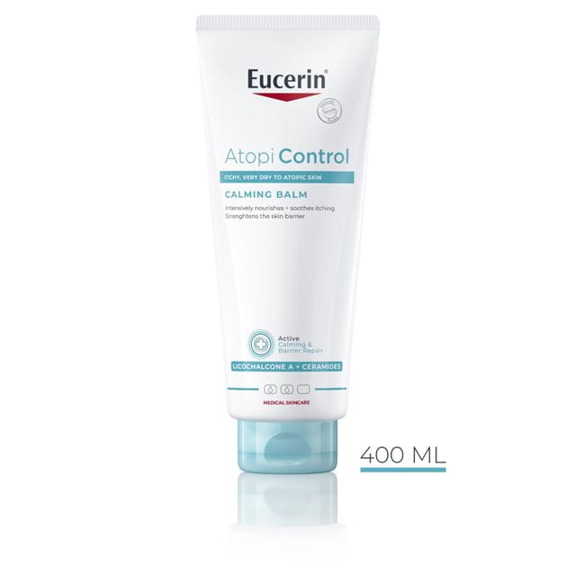 Eucerin AtopiControl Calming Balm is a daily-use body balm that has been specially formulated to soothe and intensely moisturize irritated and itchy skin. The light but nourishing oil-in-water balm is enriched with soothing Licochalcone A, Ceramides and Shea butter to strengthen skin’s barrier and relieve dryness and itching. It should also be used during a flare-up alongside Eucerin AtopiControl Acute Care Cream, Eucerin Anti-Itch Spray and your usual medication. The atopic eczema balm provides instant moisture to make skin soft and smooth and, with regular application, skin condition noticeably improves.