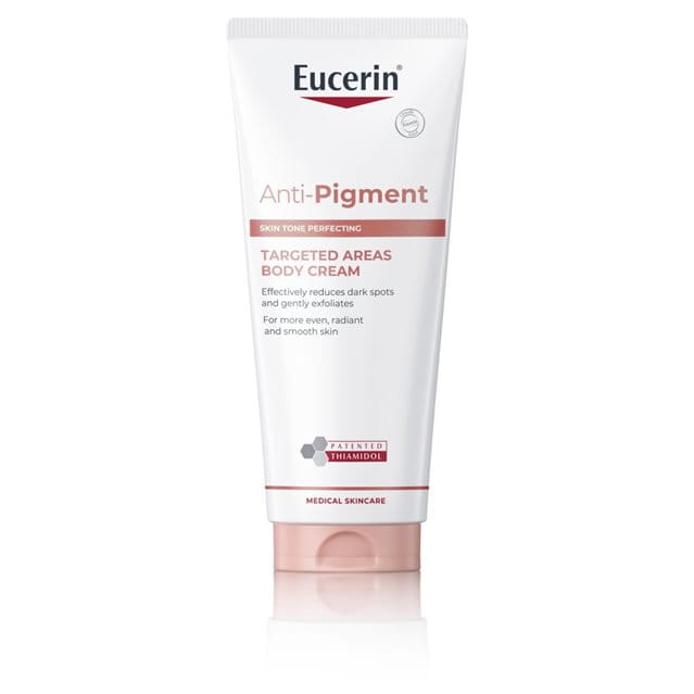 Eucerin Anti-Pigment Targeted Areas Body Cream combines powerful active ingredients that work in different ways to promote your skin’s radiance and reduce hyperpigmentation at the source by effectively reducing the appearance of dark spots while thickening skin on friction areas (knees, elbows), small areas of post-inflammatory hyperpigmentation: