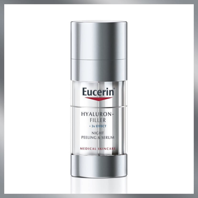 Eucerin Hyaluron-Filler Concentrate is an intensive anti-wrinkle serum designed to be used daily in combination with Eucerin Hyaluron-Filler day and night creams. It boosts the moisturizing and wrinkle-filling benefits of the care products in the range. Eucerin Hyaluron-Filler Night Peeling & Serum has been formulated for use overnight in conjunction with Eucerin Hyaluron-Filler Night. Like the concentrate, Eucerin Hyaluron-Filler Night Peeling & Serum contains concentrated Hyaluronic Acid to increase skin moisturization. It also contains an AHA (alpha-hydroxy-acid) Complex for exfoliation.