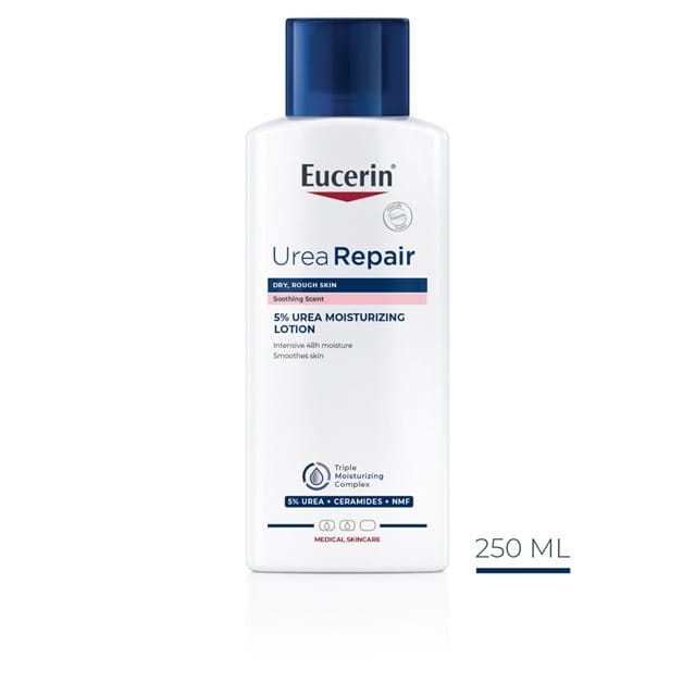 Eucerin’s UreaRepair 5% Urea Moisturizing Lotion (soothing scent) contains Urea and other Natural Moisturizers (to bind water into the skin) and Ceramides (to repair the skin barrier and reduce moisture loss). The formula gives immediate relief and delays the symptoms of very dry skin (such as roughness and scaliness) for up to 48 hours.